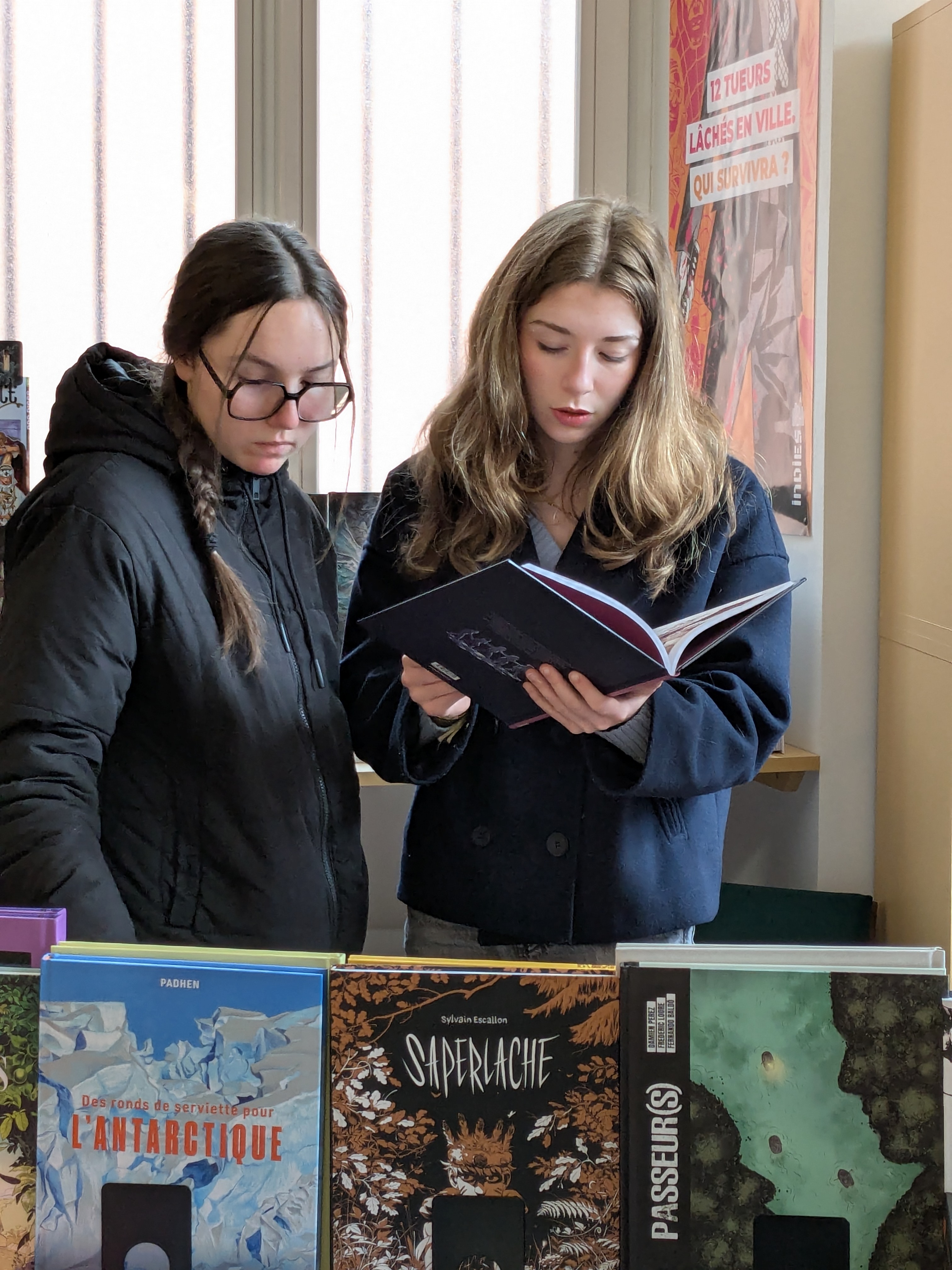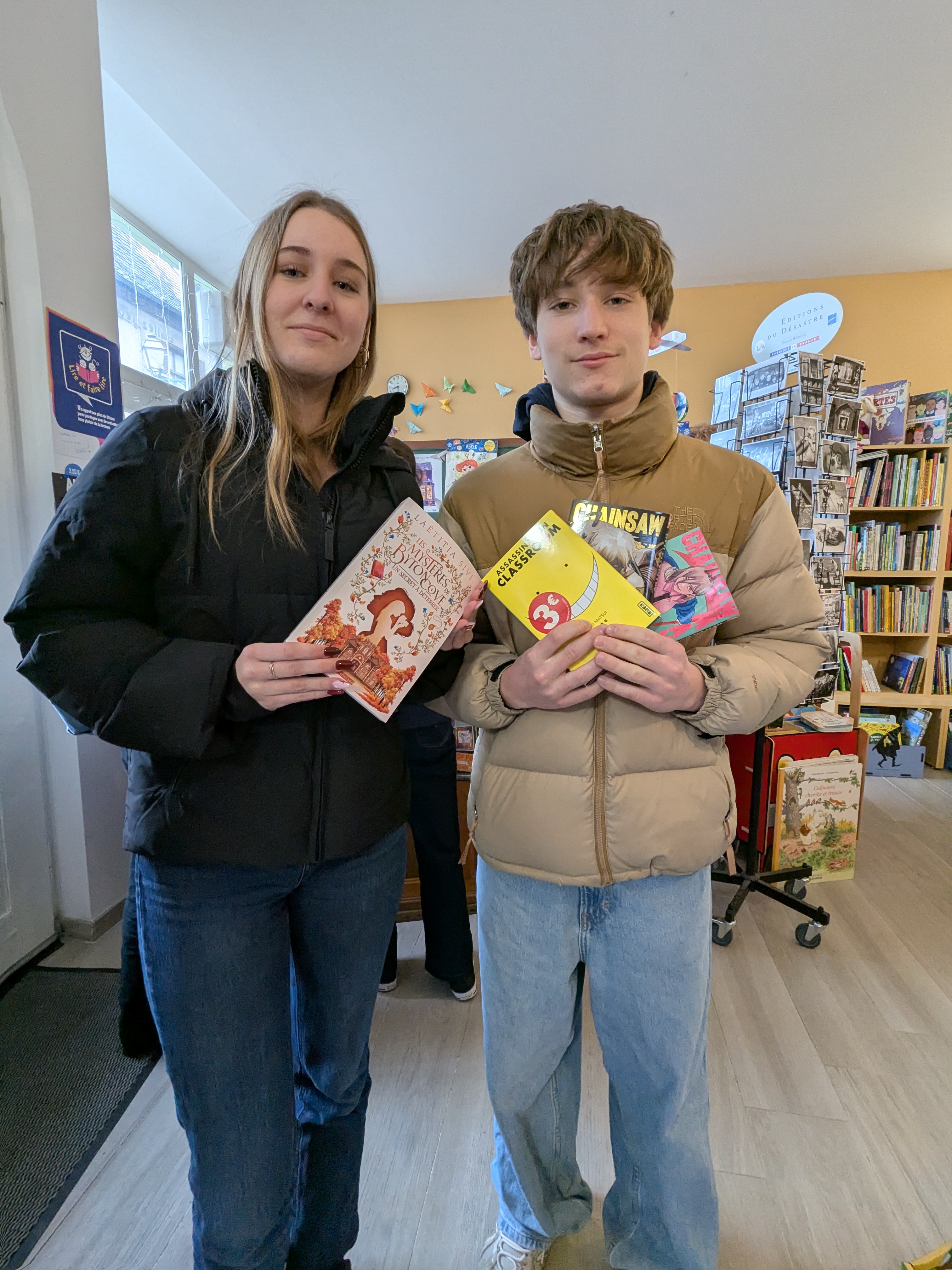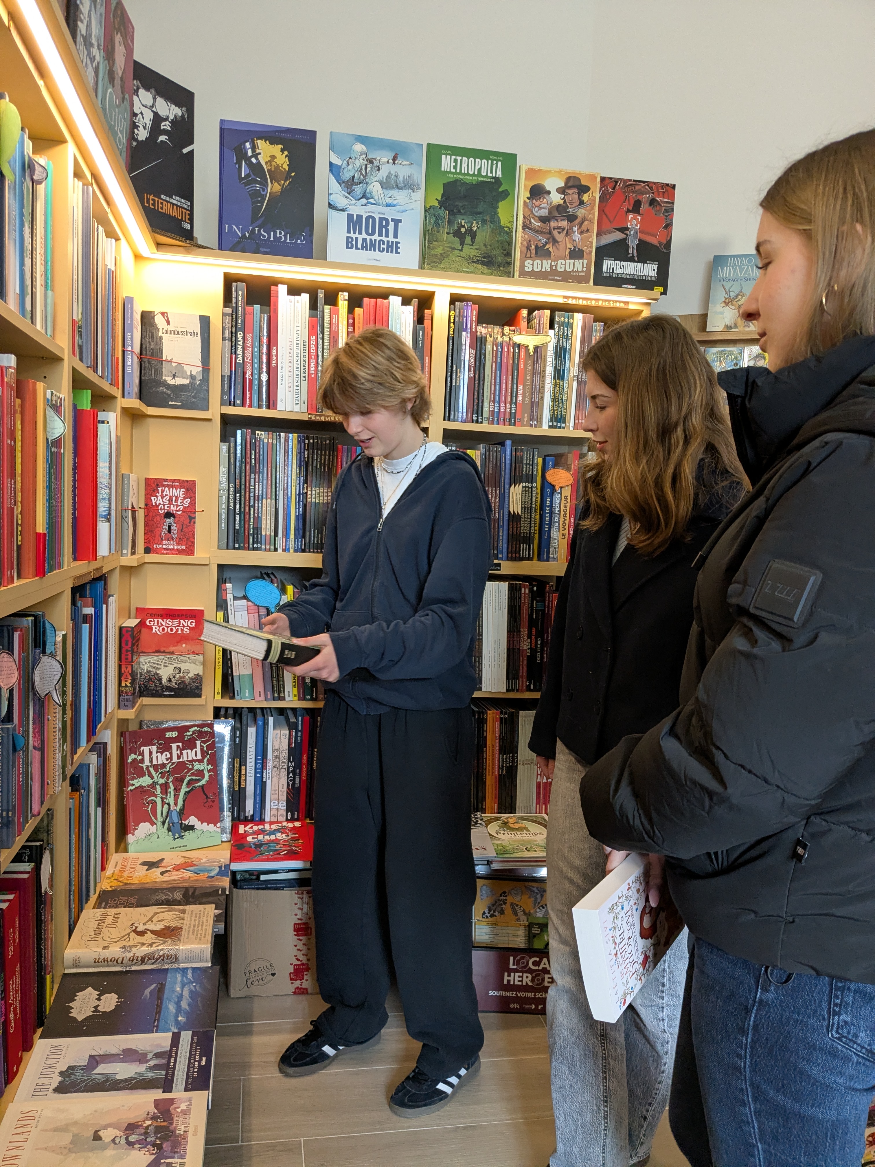 Le 10 avril, nous sommes allés à la librairie par petits groupes accompagnés du documentaliste M. Schwoerer. C’est Laura qui nous a accueillis et qui nous a présenté l’organisation du local. La librairie est séparée en deux, avec le côté droit agencé par sa collègue Magali Erdmann, qui concerne les BD « adultes » et des mangas ainsi que quelques romans. Du côté gauche il y a l’espace de Laura Bernard qui concerne les BD et les histoires de jeunesse.
