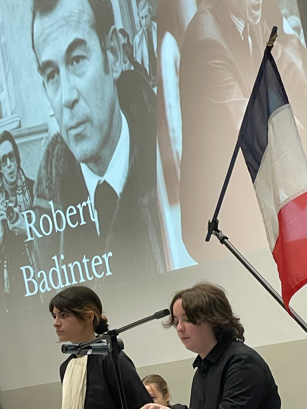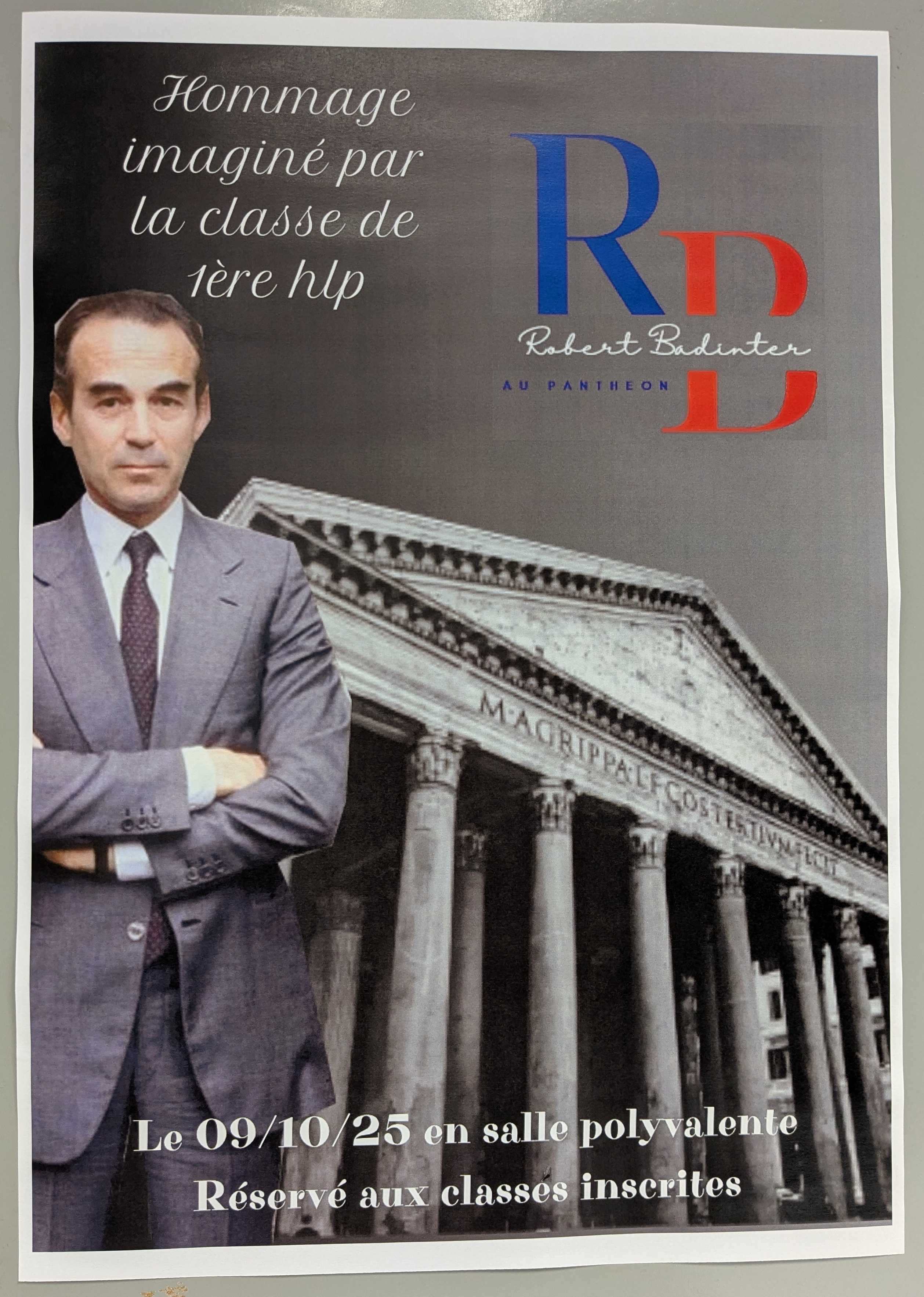 Les élèves de la classe de 1ère HLP (Humanités littérature philosophie), à l’occasion du 44ᵉ anniversaire de la loi abolissant la peine de mort, ont honoré Robert Badinter, le jeudi 9 octobre 2025, jour de son entrée au Panthéon. Les lycéens soutenus par Mme Amable, leur professeure de spécialité, on rendu un vibrant hommage à cet homme, figure majeure du combat pour les droits humains.